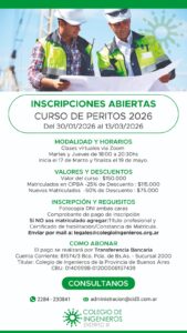 El Colegio de Ingenieros Distrito III mantiene abierta la inscripción para el Curso de Peritos 2026. El periodo de registro finaliza el 13 de marzo.