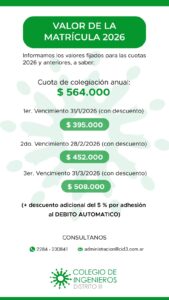 El Colegio de Ingenieros Distrito III informó los valores fijados para las cuotas de colegiación del año 2026 y periodos anteriores. El monto anual se estableció en 564.000 pesos.
